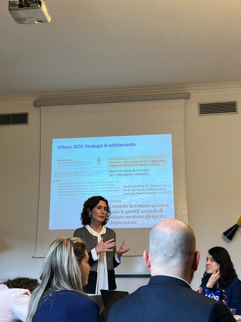 A central moment of the afternoon was the presentation entitled “Proximity work in the Municipality of Milan: qualitative analysis of impacts on workers and territory”, delivered by Ilaria Mariotti and Federica Rossi (DAStU, Politecnico di Milano). The research, developed in collaboration with the Comune di Milano, examined how smart working arrangements are influencing employees’ well-being, work-life balance, organizational processes, and the everyday geographies of the city.