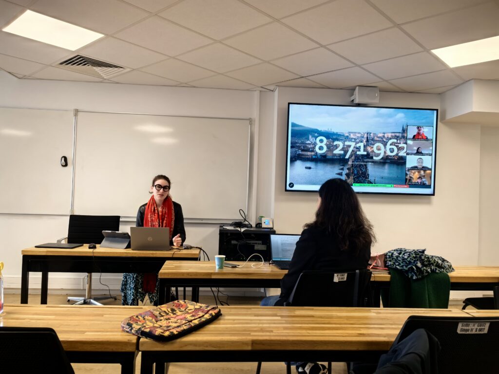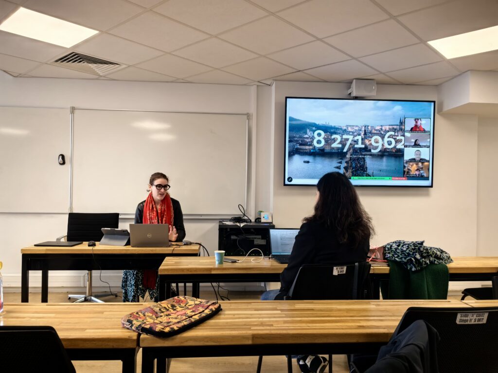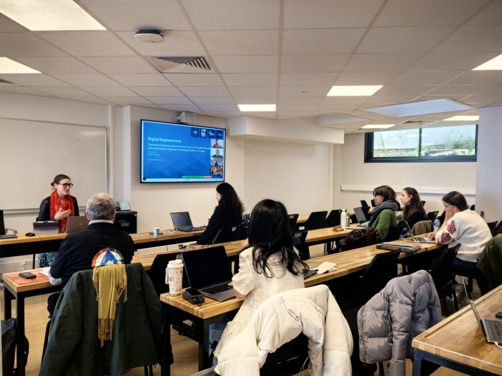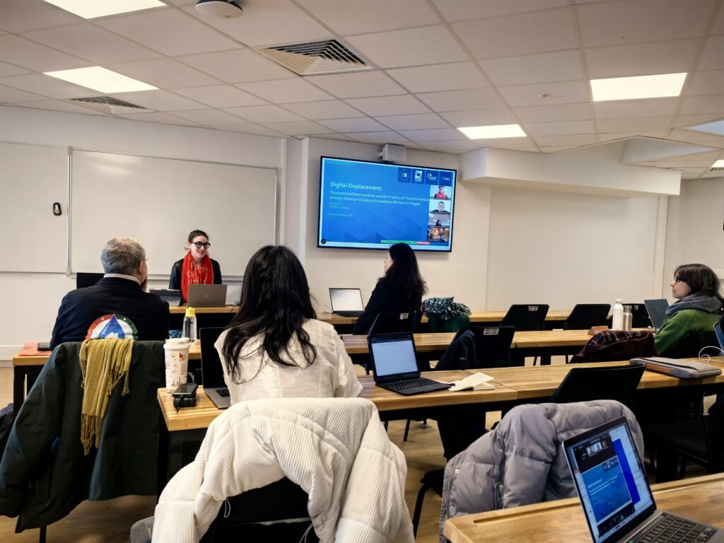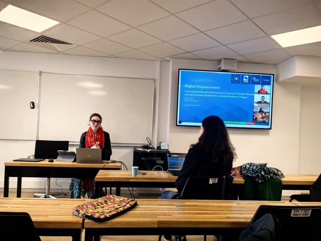Central to the presentation was the concept of “double nomadism,” describing how displaced Ukrainian professionals navigate dual instability: fleeing physical violence while living under temporary protection in Czechia, and simultaneously maintaining economic and professional ties to Ukraine or international clients through remote work.