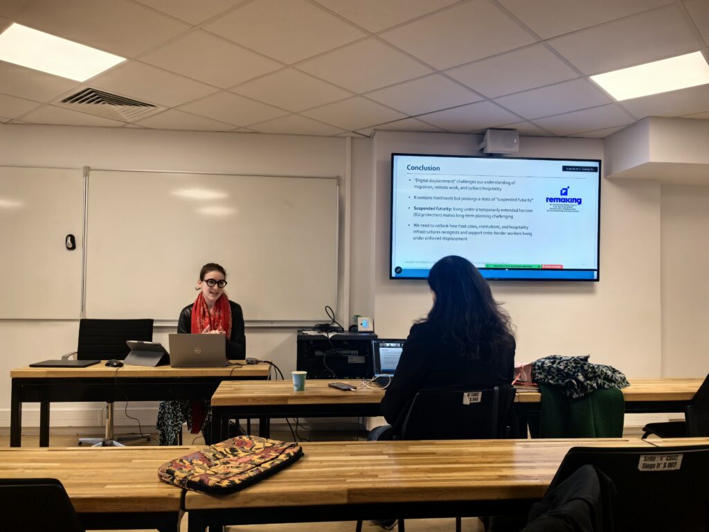 The presentation concluded by emphasizing REMAKING’s commitment to generating practical, place-based policy solutions. By highlighting gaps in current urban hospitality systems and institutional frameworks, Kania underscored the need for better recognition and protection of vulnerable, cross-border remote workers navigating displacement and digital labour simultaneously.