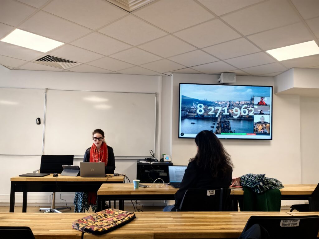 Titled “Digital Displacement: Transnational Remote Work and the Practice of ‘Double Nomadism’ among Ukrainian Displaced Knowledge Workers in Prague,” the presentation addressed an audience of tourism geographers by challenging dominant narratives of “digital nomadism.” Kania contrasted Prague’s global image as a desirable destination for privileged remote workers with the constrained and precarious conditions faced by Ukrainian refugees.
